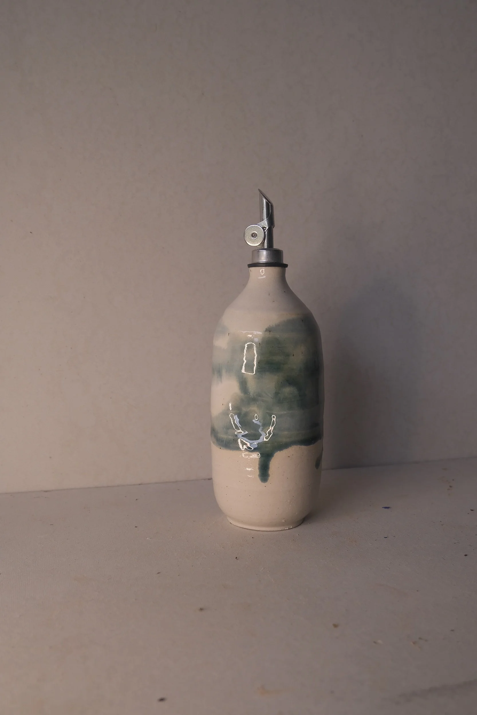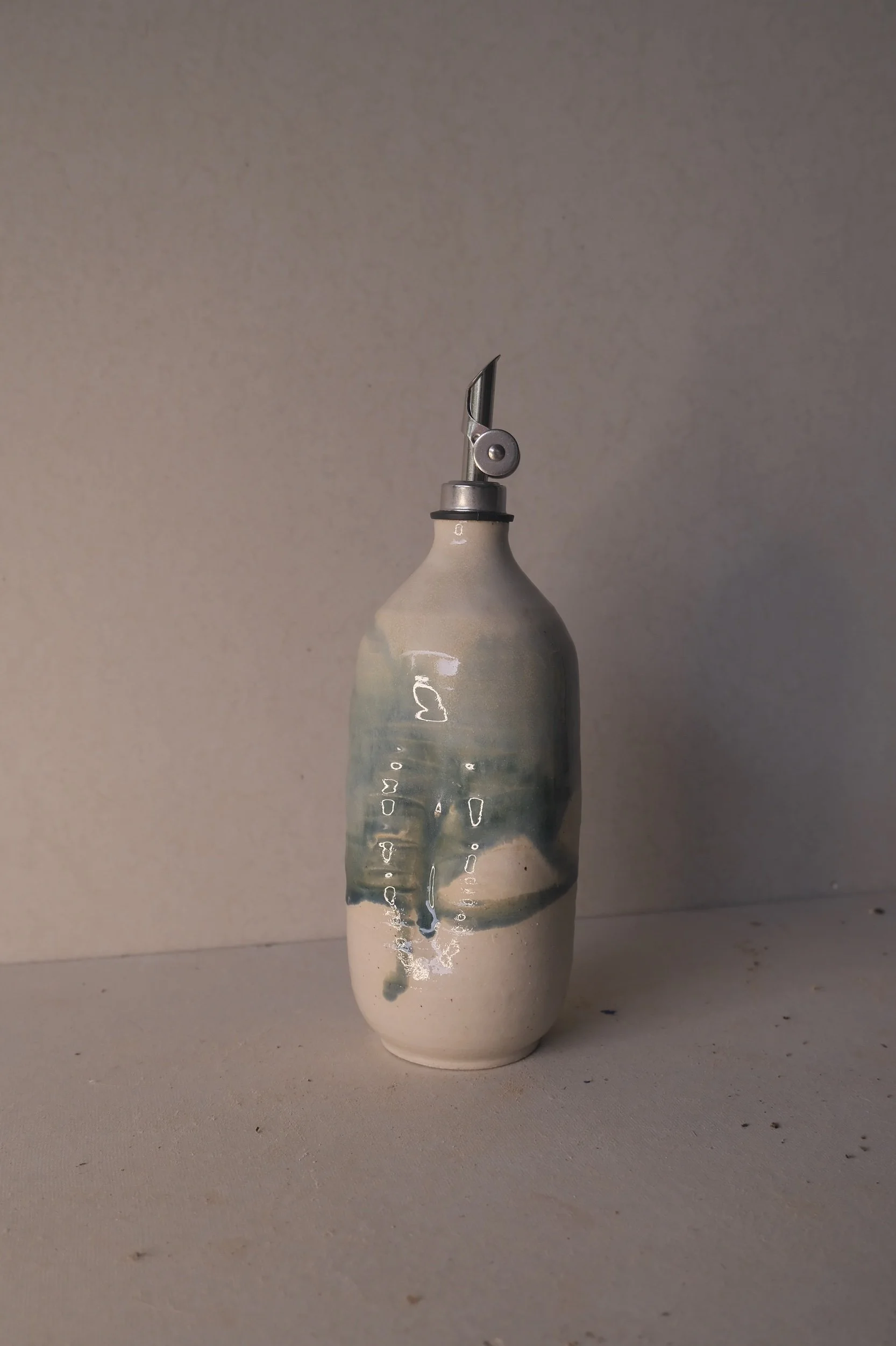 I wanted to make something that showed the hand of the maker, a vessel that felt organic, comforting and a little refined, enter the oil pourer. Finished with an ergonomic grip, making the piece comfortable to hold and each one a little unique.